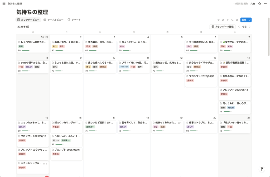 そんなふうに“自分の心の傾向”をデータで把握できるのは、ちょっと面白くて、安心にもつながります。 また、カウンセラーさんにNotionのURLを共有していて、必要に応じて読んでもらったりもしています。