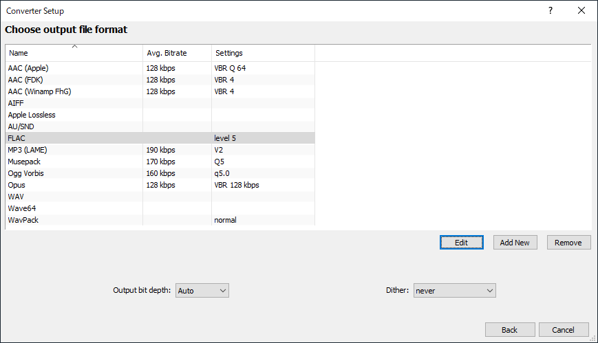 私の場合はここでFLACを選択し、さらに”Edit”から”Compression Level”を5に変更したものを使用しています。