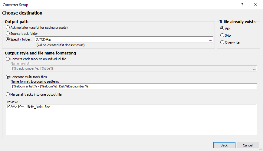 ”Covert each track to an indiividual file”では、1トラック毎に1つの音楽ファイルを生成する方式です。